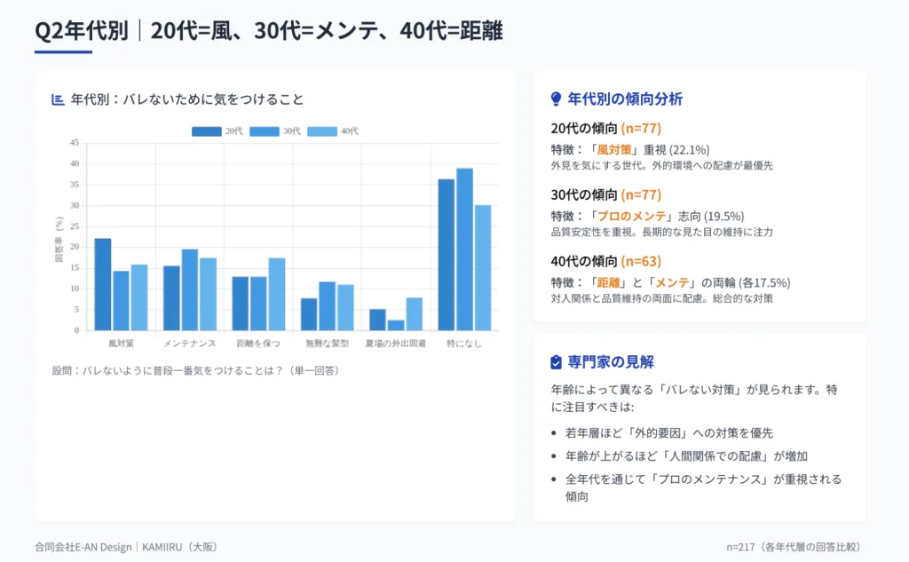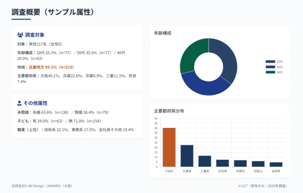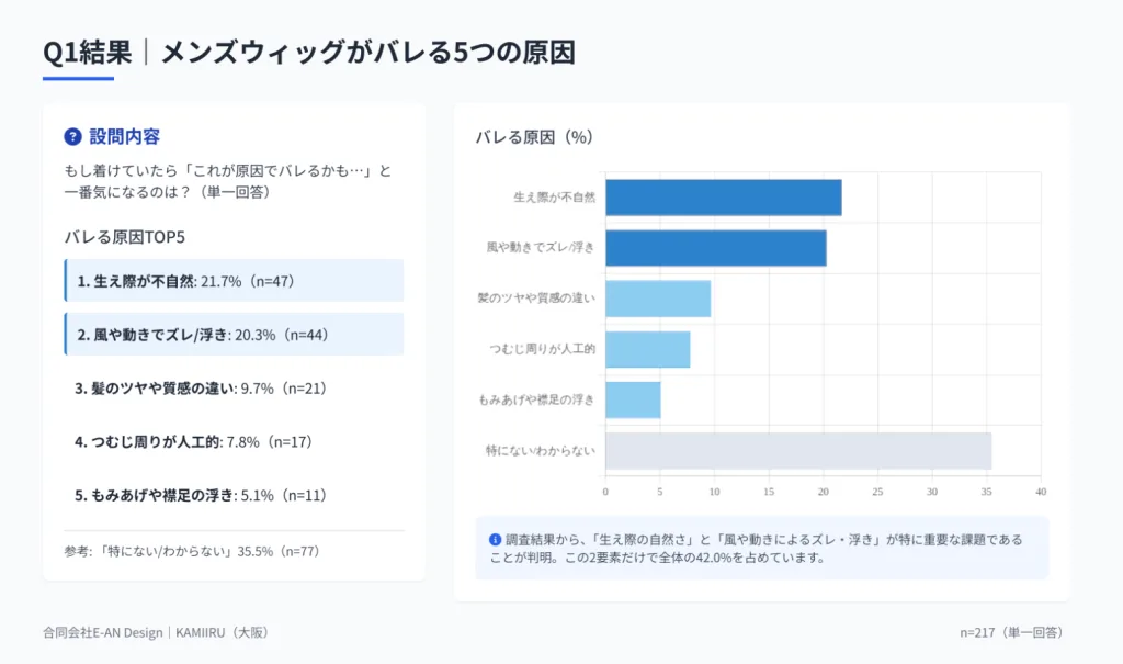 今回、私たち合同会社E-AN Designは、ウィッグへの関心が高いと思われる20代から40代の男性217名(20代 35.5%、30代 35.5%、40代 29.0%)を対象に、「ウィッグがバレる原因」に関する独自アンケート調査を実施しました。