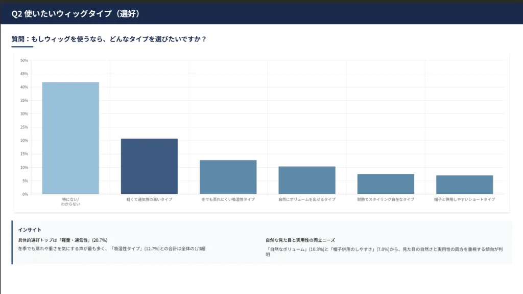 ニット帽を着用することでウィッグが押しつけられ、脱いだときにつむじ部分がペタッと潰れたり、毛流れが不自然になったりする現象は、ウィッグユーザー共通の悩みです。私たちは、この「ニット帽を脱いだ瞬間」の不自然さを解消することこそが、冬のウィッグ選びの最重要課題だと捉えています。また、「乾燥や静電気でのパサつき」を懸念する声も11.7%(25名)あり、冬の乾燥した空気と暖房による室内外の温度差が、ウィッグの質感維持を難しくしている要因です。
