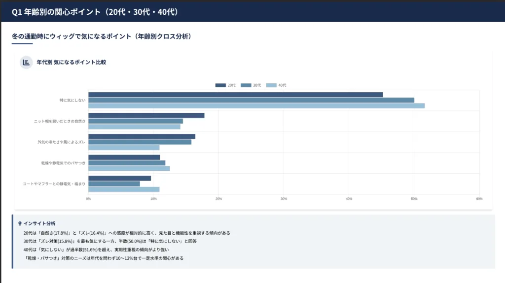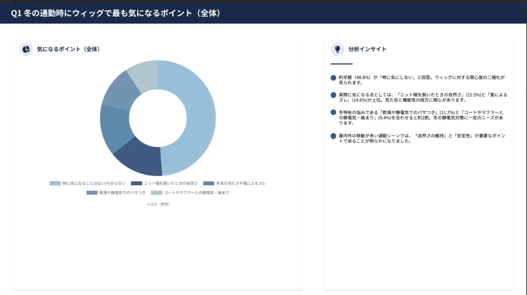 これらの環境変化が、「外気の冷たさや風によるズレ」(14.6%・31名)「コートやマフラーとの静電気・絡まり」(9.4%・20名)といった具体的な悩みを引き起こしています。特に、既婚者の75名(35.2%)の中には、家族に気づかれずに自然な状態を保ちたいという切実なニーズもあるはずです。