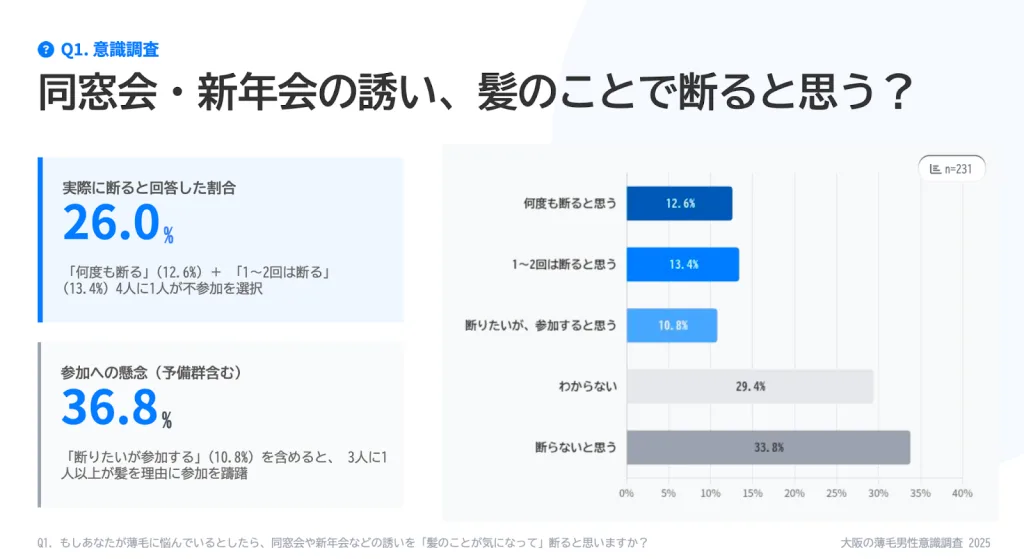 同窓会・新年会の誘い、薄毛が理由で断ったことある?大阪のハゲ・薄毛男性のリアルな声を調査