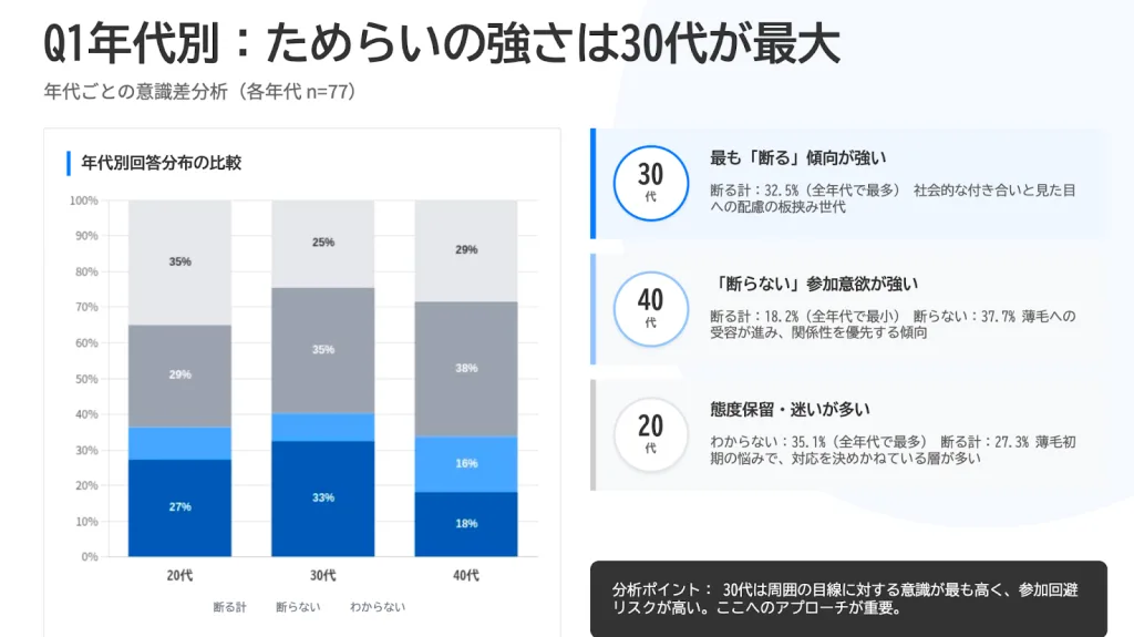 年代別に詳しく見ると、最も深刻な悩みを抱えているのは30代であることが分かりました。「何度も断ると思う」と回答した割合は、全体平均12.6%に対し、30代では15.6%と最も高い数値を示しています。20代の11.7%、40代の10.4%と比較しても、30代の「拒絶感」は突出しています。30代は仕事でも責任が増し、結婚式や同窓会など、公私ともに人前に出る機会が増える時期です。そんな働き盛りの世代にとって、薄毛は「老けて見える」という恐怖以上に、自己管理能力や自信の喪失に直結しやすい問題なのかもしれません。「1〜2回は断る」という回答も30代は16.9%と高く、合計すると3割以上の30代男性が、薄毛を理由に大阪の社交場から離れようとしています。この世代にとって、外見の自信回復は急務と言えるでしょう。