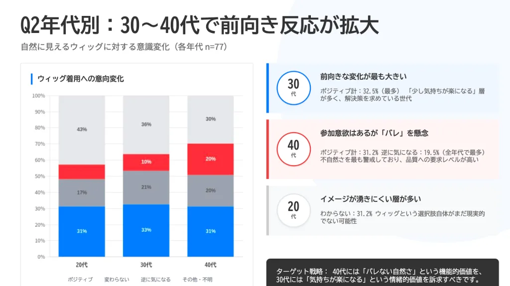 「もし自然に見えるウィッグがあったら?」という問いに対して、ポジティブな変化を期待する回答が相次ぎました。「自信を持って参加できると思う(15.6%)」と「少し気持ちが楽になって参加しやすくなる(16.0%)」を合わせると、全体の31.6%(73人)がウィッグによって行動が変わると答えています。この数字は、薄毛を理由に誘いを断っている層(26.0%)を上回っており、ウィッグが単なる「隠し味」ではなく、人生を前向きに変える「きっかけ」になり得ることを示しています。特に注目すべきは「自信を持って参加できる」と答えた人の割合が、20代と40代で共に16.9%と高かった点です。若年層のファッションへの意欲と、ミドル層の身だしなみへの意識。この両輪が「自然さ」という条件さえクリアできれば、ウィッグを強力な味方として受け入れる準備ができていることを示しています。