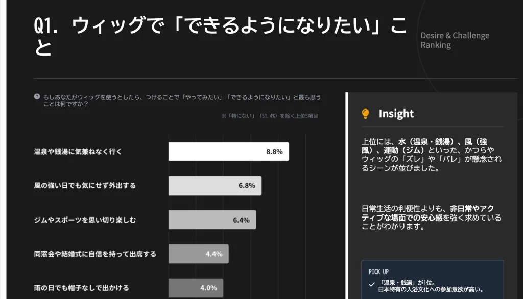 具体的な回答で最も多かったのは「温泉や銭湯に気兼ねなく行く」の8.8%でした。次いで「風の強い日でも気にせず外出する(6.8%)」、「ジムやスポーツを思い切り楽しむ(6.4%)」と続きます。これらの結果から、薄毛に悩む男性の多くが、日常生活の何気ないシーンで「人目を気にして制限をかけている」という実態が浮き彫りになりました。特に風や水、激しい動きを伴う場面での不安を解消したいというニーズが強く、ウィッグがそれらの障壁を取り払う「自由の翼」になり得ることが分かります。