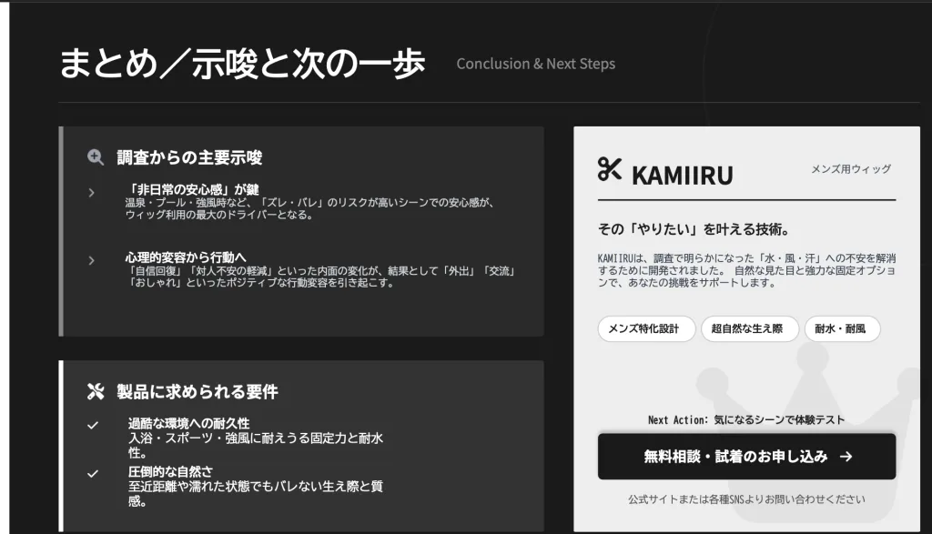 今回の調査を通じて、大阪の男性たちがウィッグに求めているのは「制限のない自由」と「自分を肯定できる心」であることが明確になりました。カミール(KAMIIRU)は、そんな皆さんの想いに応えるため、自然さと快適さを追求したメンズウィッグを提案しています。たとえ今は不安があっても、一歩踏み出せば「温泉」も「スポーツ」も「同窓会」も、すべてが楽しみなイベントに変わります。数値が証明している通り、ウィッグはあなたの人生を劇的に明るくする「解決策」です。もう一人で悩まず、新しい自分への扉を開いてみませんか。