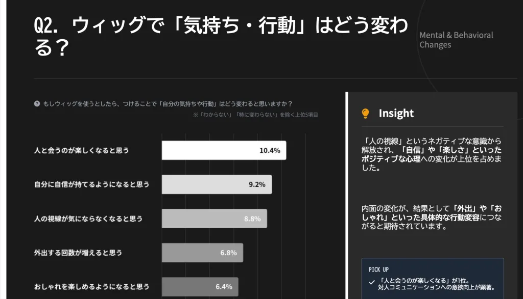その結果、ウィッグは単に髪を増やすツールではなく、失いかけていた「自信」や「行動力」を取り戻すための鍵であることが分かりました。この記事では、ランキング形式で調査結果をご紹介し、ウィッグがある生活でどのような変化が訪れるのかを具体的にお伝えします。