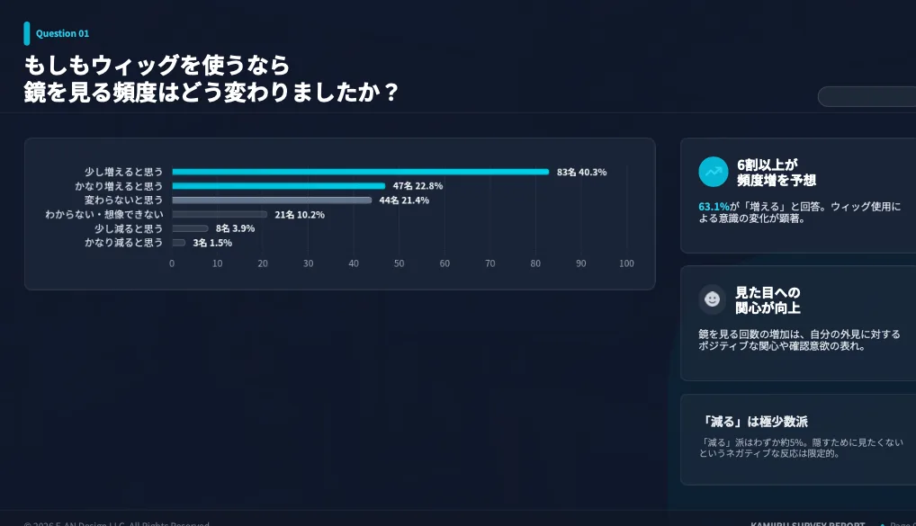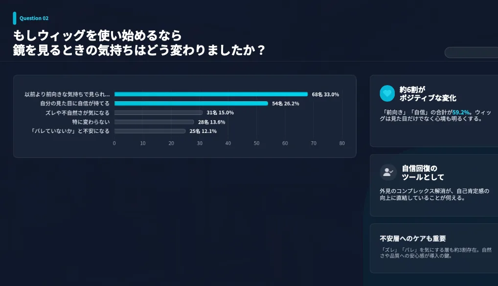 今回、大阪の男性206名のアンケートデータを通して、ウィッグがもたらす心境の変化を見てきました。6割以上の方が、鏡を見る回数が増え、前向きな気持ちになれると回答しています。