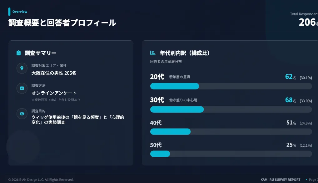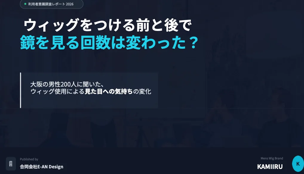 メンズウィッグ「カミール(KAMIIRU)」を担当している合同会社E-AN Designです。今回は、大阪の男性206名を対象に行ったアンケート結果をもとに、ウィッグがもたらす「心と行動の変化」について深掘りしていきます。薄毛の悩みは、単に髪がないことだけではありません。「鏡を見るのが怖い」「自分に自信が持てない」といった内面の問題も大きいものです。