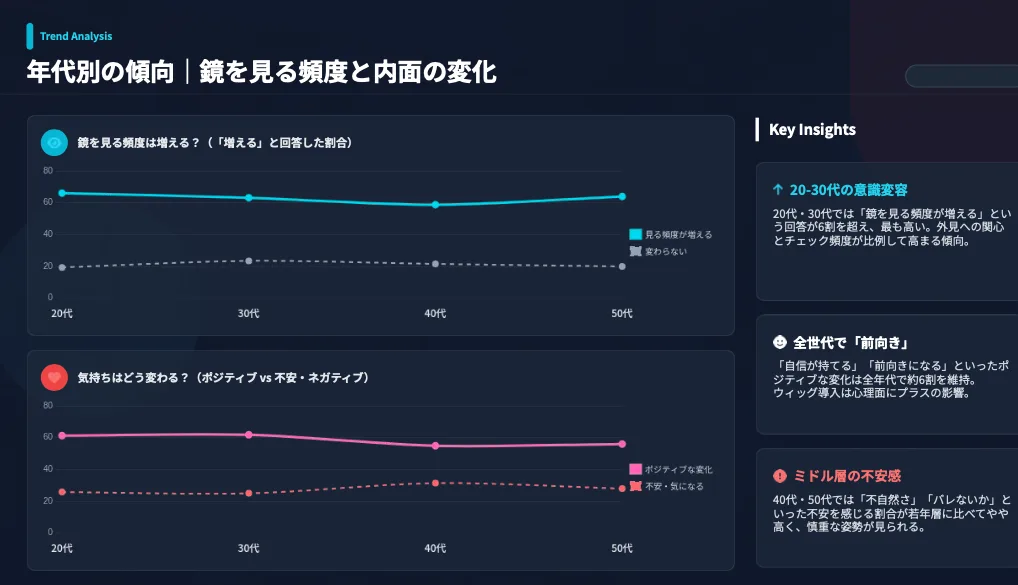 しかし、先述の通り、実際にイメージしてみた人の6割以上が「鏡を見る回数が増える」と予測しています。この21名の方々は、まだ「理想の自分」に出会うチャンスを少しだけ先延ばしにしているだけかもしれません。髪型が変われば、服の選び方が変わり、表情が変わり、休日の過ごし方さえ変わります。「想像できない」状態から一歩踏み出し、実際にウィッグをつけた自分の姿を鏡で見た瞬間、その21名の意識は劇的に変化するはずです。私たちは、その「驚きの瞬間」を提供するために存在しています。