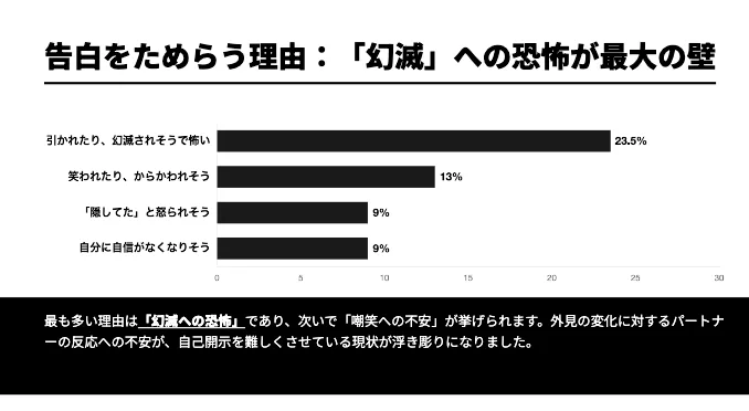 告白をためらう理由として最も多かったのが「引かれたり、幻滅されそうで怖い」で23.5%。次いで「笑われたり、からかわれそう」が13%、「『隠してた』と怒られそう」と「自分に自信がなくなりそう」がそれぞれ9%と続きます。これらの回答に共通するのは、「相手の反応に傷つくことへの恐れ」です。特に幻滅への恐怖は他を大きく引き離しており、自己開示を難しくさせている最大の要因と言えます。薄毛という外見上の悩みが、自己肯定感の低下と結びつき、正直に話す勇気を奪っている現状が、この調査から明確に見えてきました。