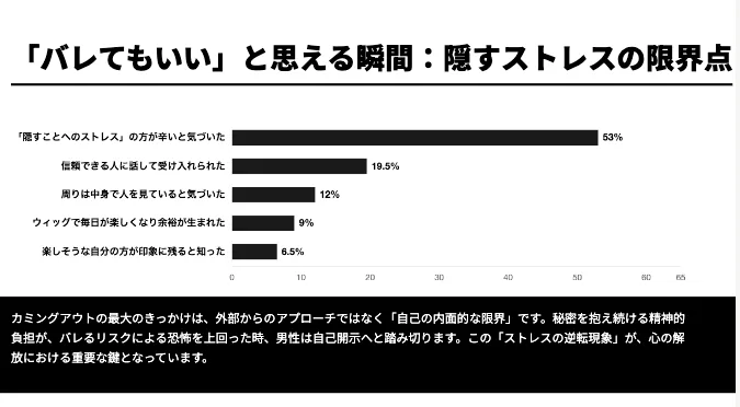 「バレてもいい」と思えるようになった最大のきっかけは何か——調査の結果、最も多かった回答は「『隠すことへのストレス』の方が辛いと気づいた」で、実に53%が選択しました。過半数の男性が、バレることへの恐怖よりも「隠し続けること」の精神的負担の方が重くなった瞬間に、気持ちが切り替わっていたのです。この「ストレスの逆転現象」は非常に示唆的です。外部からの働きかけではなく、自分の内側の限界が、心を解放するスイッチになっていた。つまり、カミングアウトへの一歩は、誰かに背中を押されるより、自分が「もう限界だ」と気づくことから始まるのです。