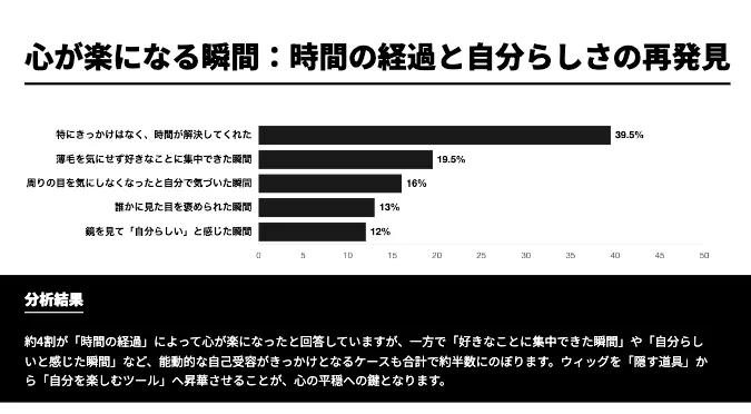 「心が楽になったきっかけ」を聞いた別の設問では、最多回答が「特にきっかけはなく、時間が解決してくれた」で39.5%でした。焦らなくていい——この数字はそう語りかけてきます。ウィッグへの不安や周囲の目への恐れは、時間とともに自然に薄れていくケースが最も多いのです。次いで「薄毛を気にせず好きなことに集中できた瞬間」が19.5%、「周りの目を気にしなくなったと自分で気づいた瞬間」が16%、「誰かに見た目を褒められた瞬間」が13%、「鏡を見て『自分らしい』と感じた瞬間」が12%と続きます。能動的な自己受容がきっかけになったケースを合計すると約半数にのぼり、時間だけでなく「自分と向き合うこと」が心の平穏への鍵であることも示されています。